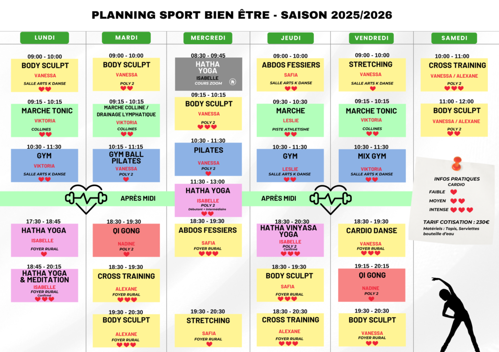 A La Une, Actualité Planning bien être 2025/2026 10 septembre 2025 Publié par : OCC 31 Août TARIF COTISATION ANNUELLE : 230€ + adhésion annuelle omnisports 15€CERTIFICAT MEDICAL OCC OBLIGATOIRE : TÉLÉCHARGER ICI JE TÉLÉCHARGE LE PLANNING